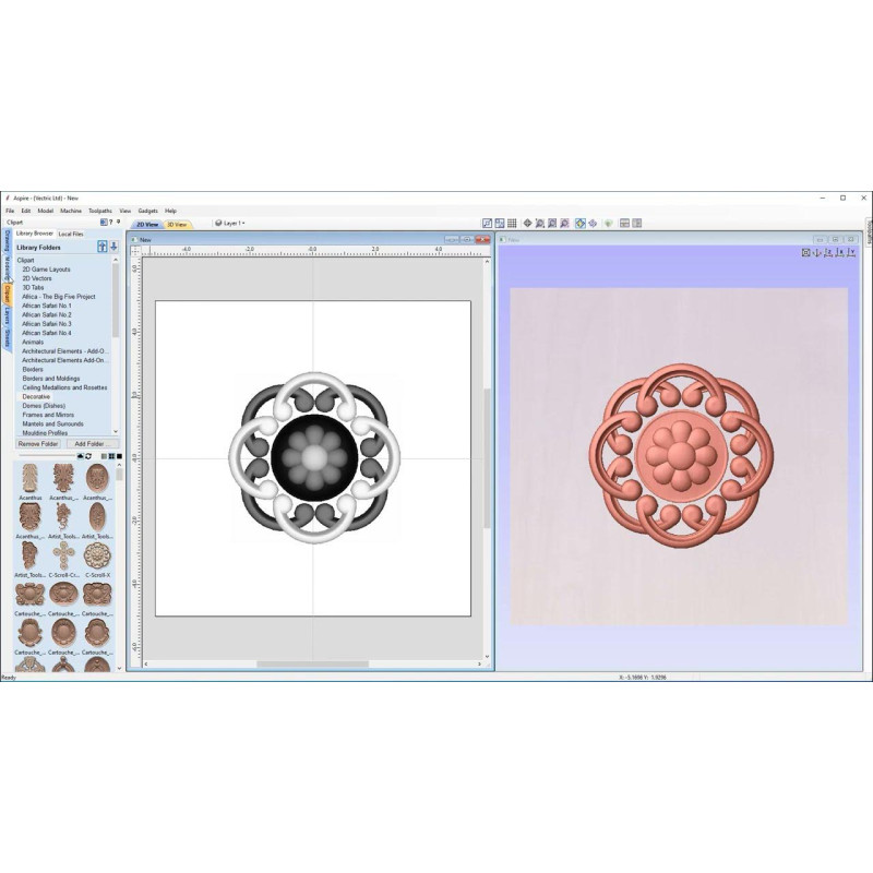 - В комплекте с Vectric Aspire поставляется встроенная библиотека готовых 3D-элементов: рельефов, декоративных рамок, орнаментов. Это особенно полезно для тех, кто хочет быстро добавить сложные элементы без ручного моделирования с нуля.
